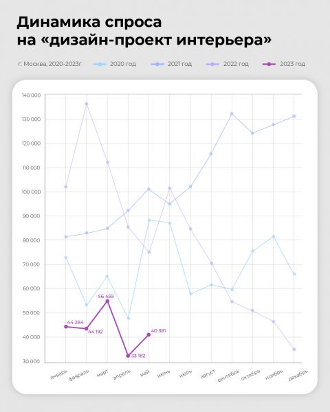 В Москве дизайн-проект интерьера спрашивали реже на 46,2% по сравнению с маем прошлого года. Но по сравнению с апрелем текущего года спрос заметно вырос — на 21%. Если сравнивать запросы прошлого года и этого, значительно чаще интересовались ценой проекта кухни и спальни. В два раза больше стало запросов «заказать дизайн ванной», «дизайн интерьера гостиной», «стоимость дизайна комнаты».