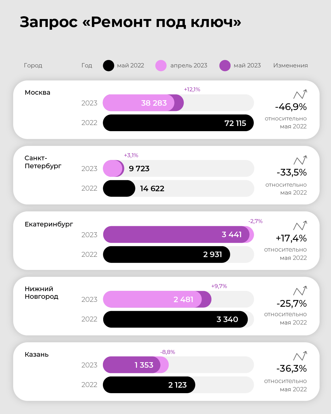 В Москве количество запросов «ремонт под ключ» снизилось на 47% по сравнению с прошлым годом и увеличилось на 12% по сравнению с апрелем текущего года. Самый резкий спад в мае этого года в сравнении с маем 2022 наблюдается в количестве запросов «комплексный ремонт», «дизайнерский ремонт», «ремонт с дизайнером».