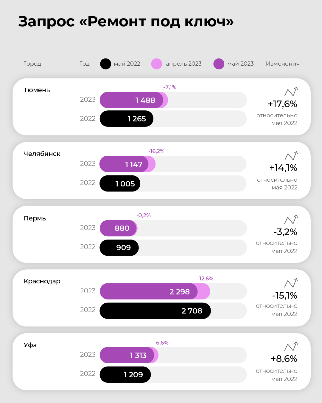 Количество запросов в категории «ремонт под ключ» по сравнению с показателями мая прошлого года выросло в Екатеринбурге, Тюмени, Челябинске и Уфе. В остальных городах наблюдается резкий спад — в Москве и Санкт-Петербурге на 47% и 33% соответственно. В остальных спад составил около 20%. Исключение составила Пермь, где количество запросов на ремонт под ключ осталось почти на прежнем уровне.